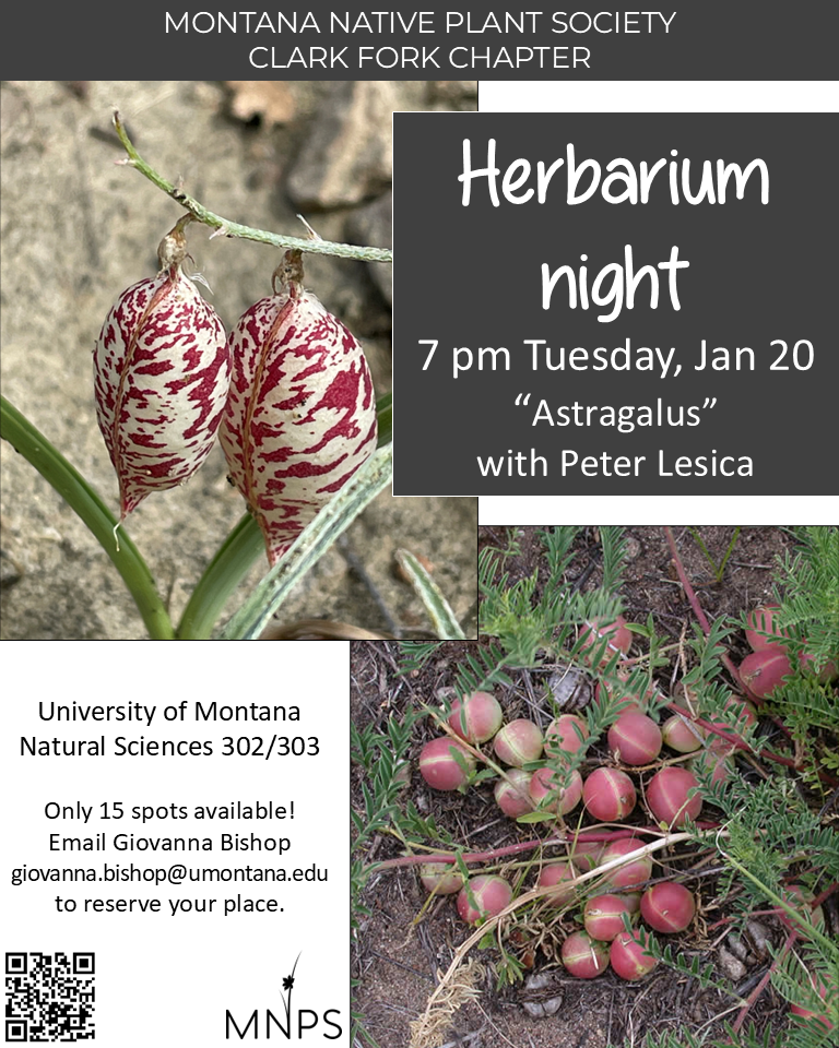 Tuesday January 20, 7:00 pm - Herbarium Night Astragalus (locoweed, milkvetch) is the second largest genus in Montana. We’ll look at some photographs and herbarium collections, and key out a few with botanist PETER LESICA. In Room 302/303 of the Natural Science Building on the UM Campus, just west of the University Center. Limited to […]