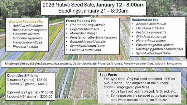 Beginning January 12 at 8 am - Native Seed Sale at the Montana Conservation Seedling Nursery The Montana Conservation Seedling Nursery is proud to announce the first official native seed sale will begin January 12 – 8:00 am. The nursery is planning on having 3 seed mixes available: Western foothills, forest meadow & reclamation. There […]